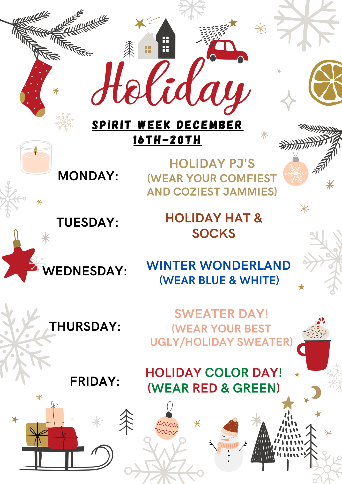 We will be doing our Holiday Spirit Week next week! We hope to see lots of students participate!!